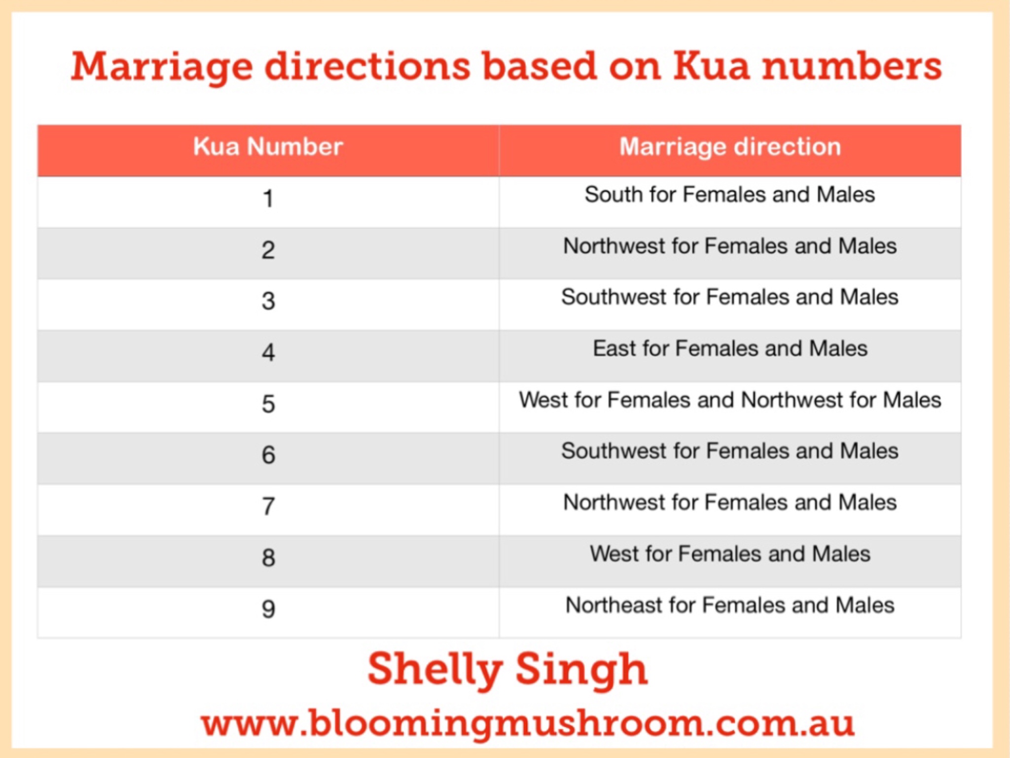 This table gives you the lucky Marriage direction based on your Kua number.