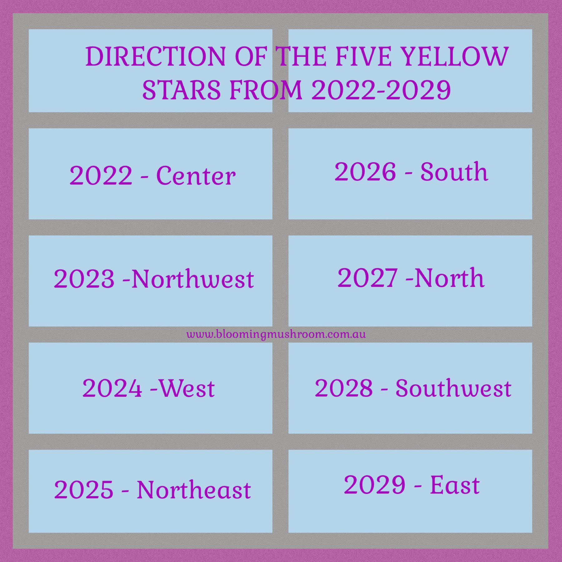 I am sharing the directions of the Five Yellow Star in the coming years so that you can plan your renovation or any changes that you want to make in and around your home, office or business.