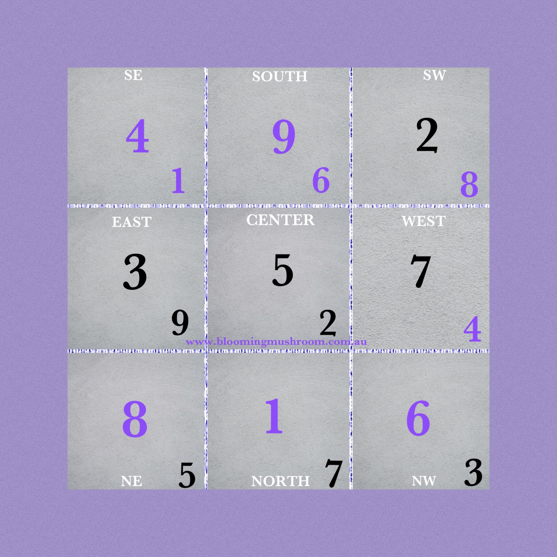 The black numbers in the Flying Star chart are negative areas. If there are two black numbers that means that area should be kept quiet and avoided, if possible.