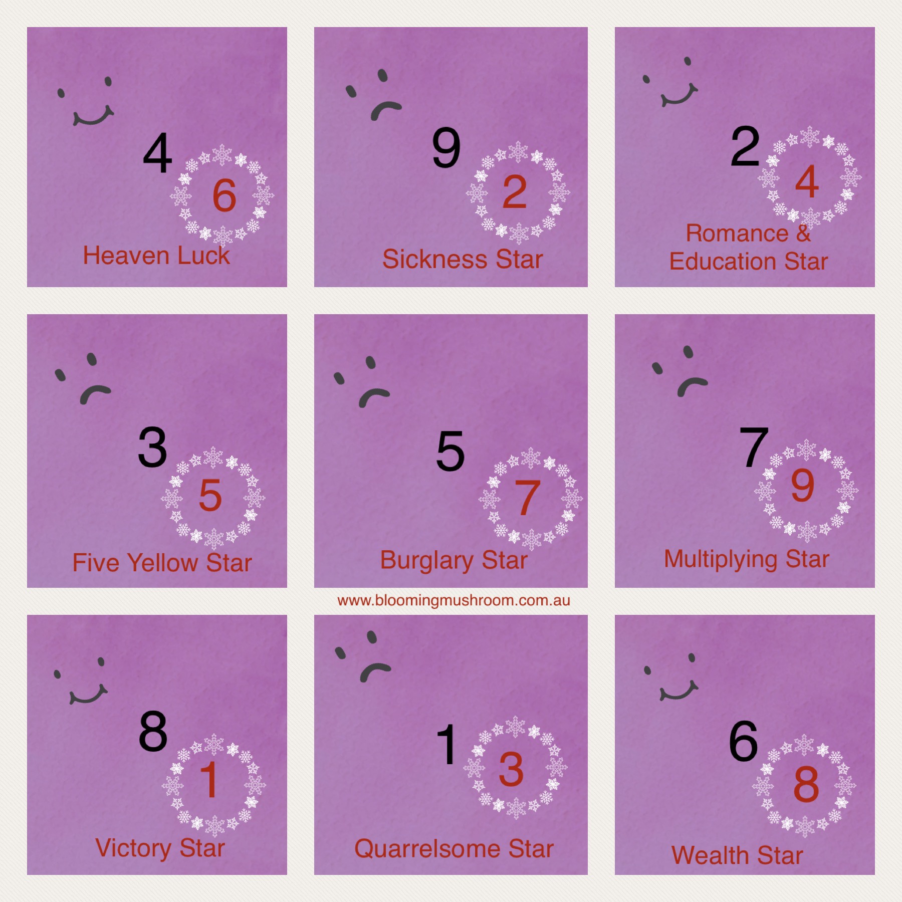 The Flying Stars (number 1 to 9) move around each month and each year, bringing different luck patterns to each compass direction and hence to each room and house/building.